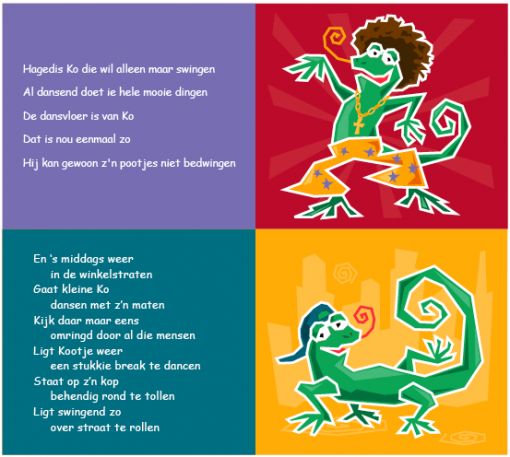 2 Pagina's uit Hagedis Ko. Dit boekje gaat over een hagedis die gek is van dansen.
